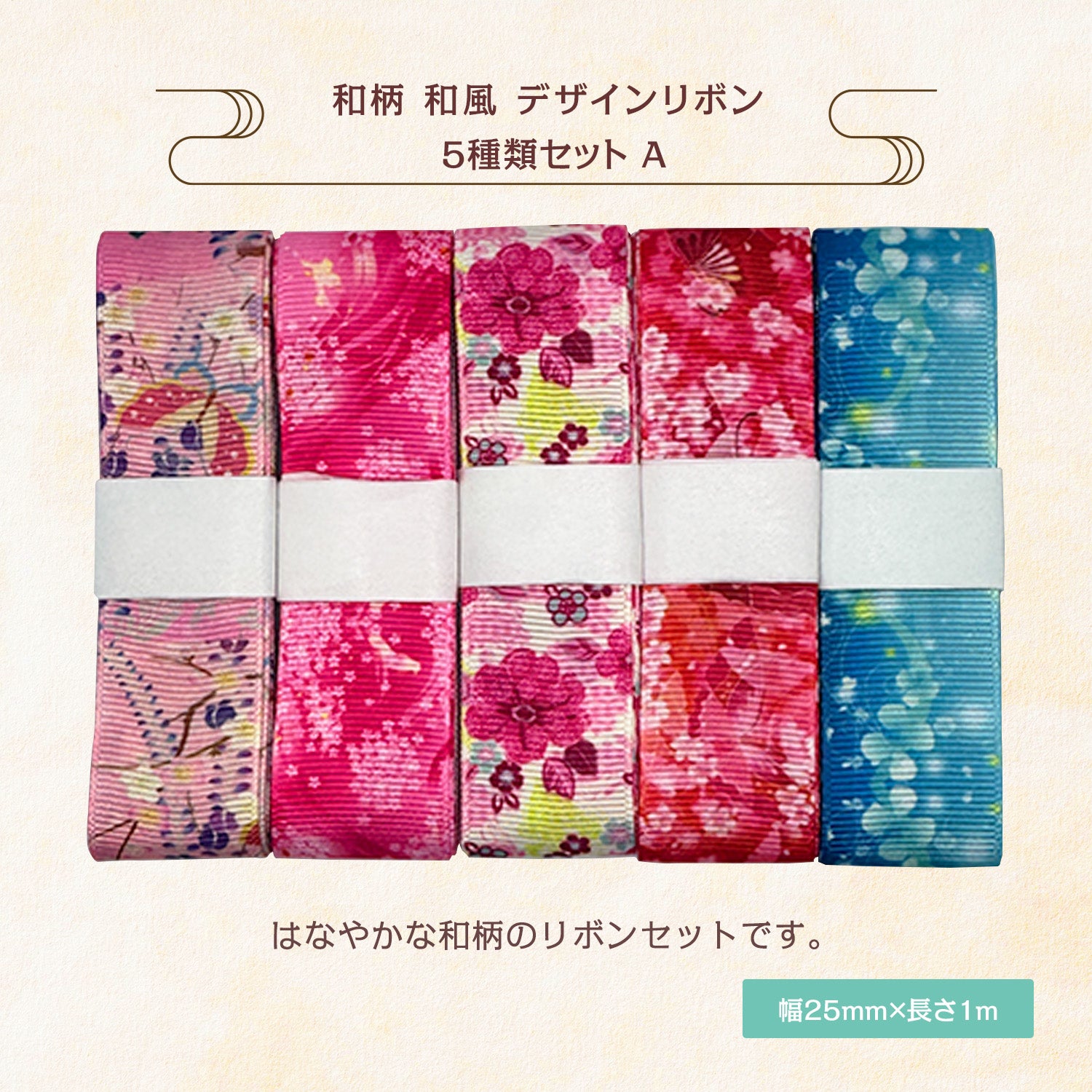 和柄 和風 デザインリボン 25mm×1m 5種類セットA 3